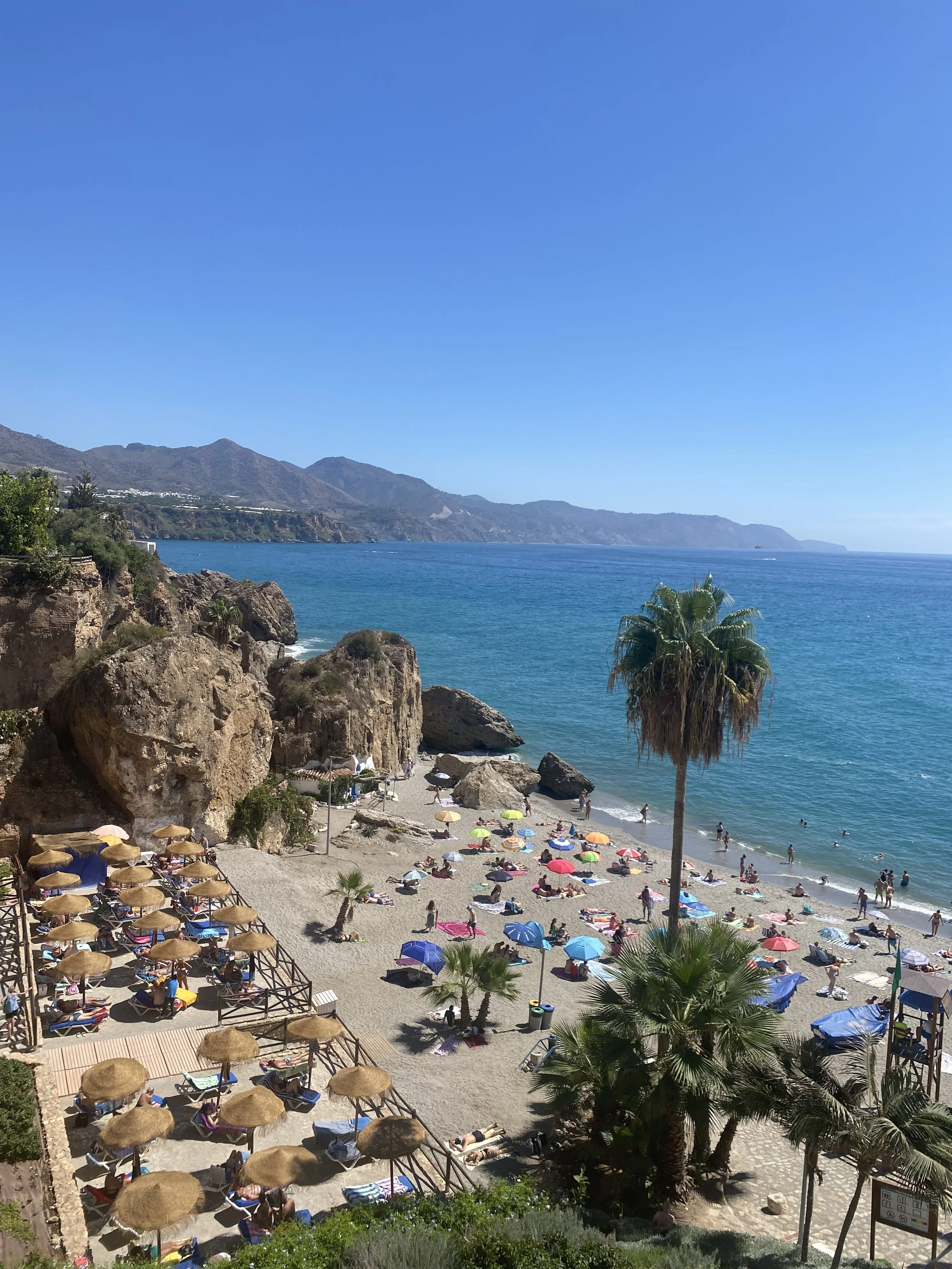 Calahonda Beach, tucked just below the Balcón de Europa, is one of Nerja’s most photographed spots — and in high season it gets very busy. Space on the sand is limited, so it’s best to arrive early in the morning if you want a good spot. Bring your own umbrella and drinks, as facilities are fewer than at larger beaches. Later in the day, when the beach is packed, it’s still worth coming down for the atmosphere, a quick dip, or to snap those postcard-perfect views of the cliffs and boats.