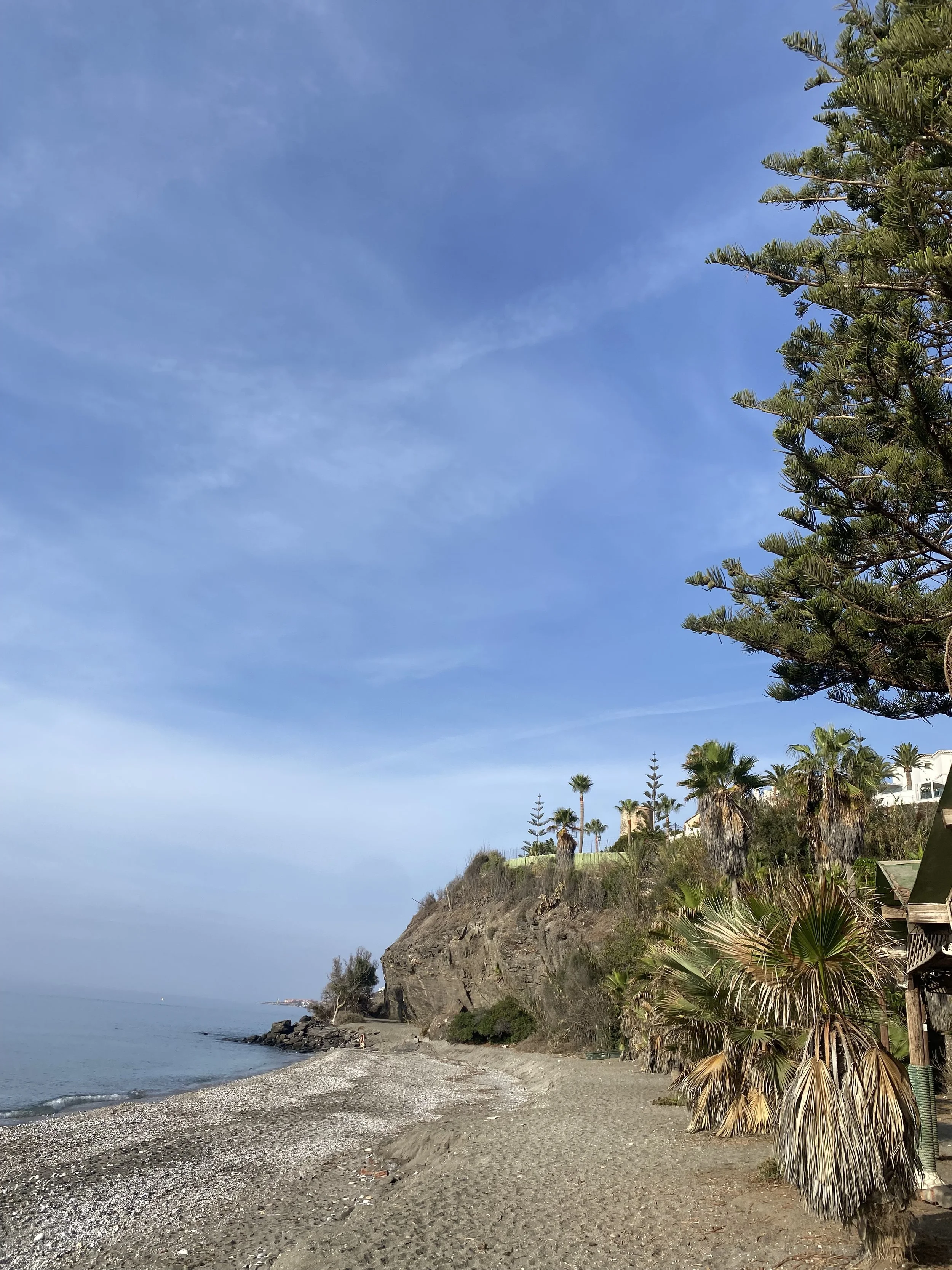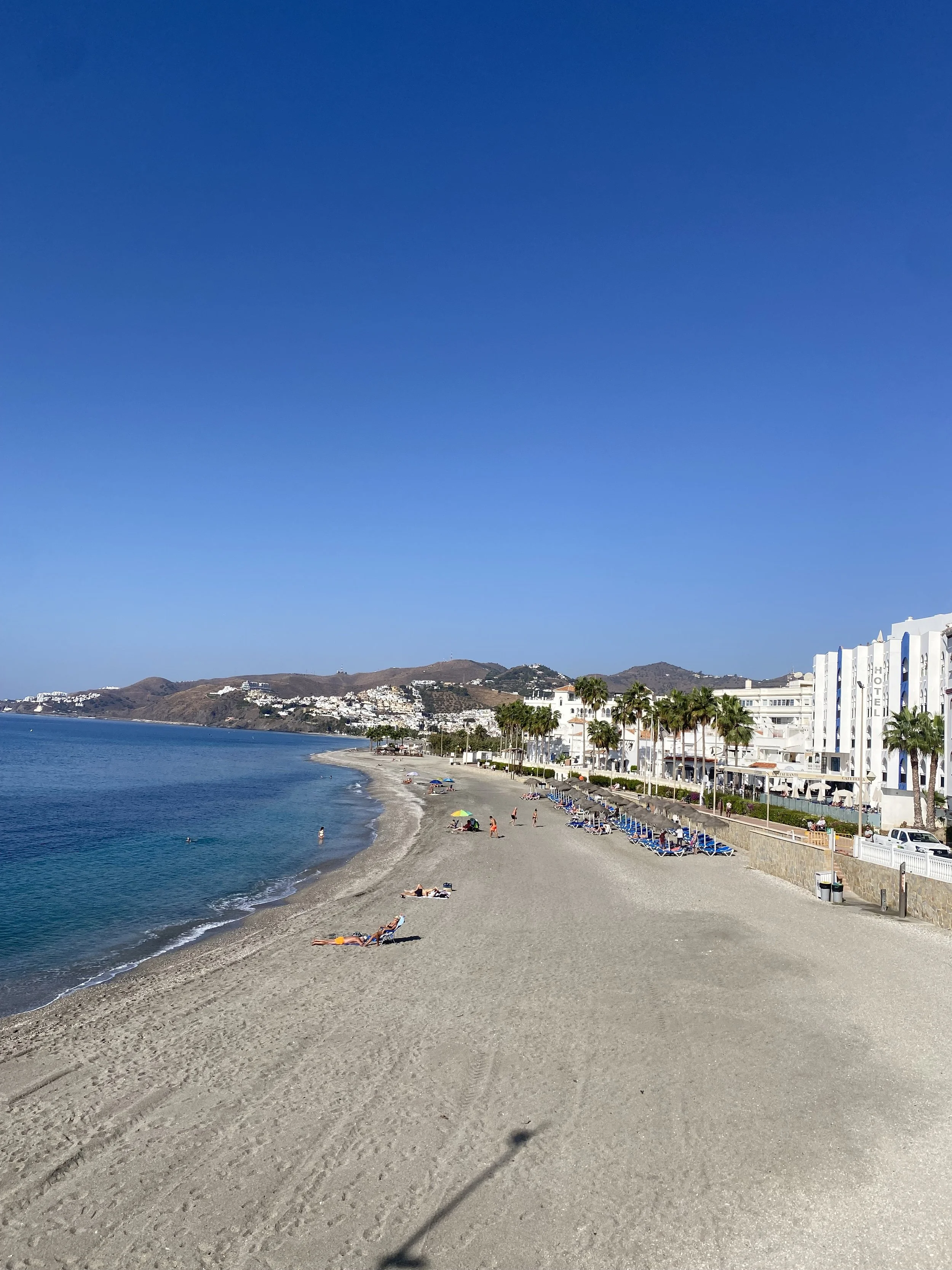 From there, the wide sandy path begins — a favourite among morning walkers, joggers, and dog owners. Between Paraíso and the chiringuitos ahead, you’ll pass a row of rustic, sun-faded apartments with a wild-west charm, then cross a small bridge before reaching Marinas de Nerja, where holidaymakers sunbathe just a few steps from the path. It’s so nicely laid out that it never feels separate — locals and visitors share the same easy seaside rhythm, and you can even pop into the hotel café for a coffee before your walk or when you pass it on the way back.
