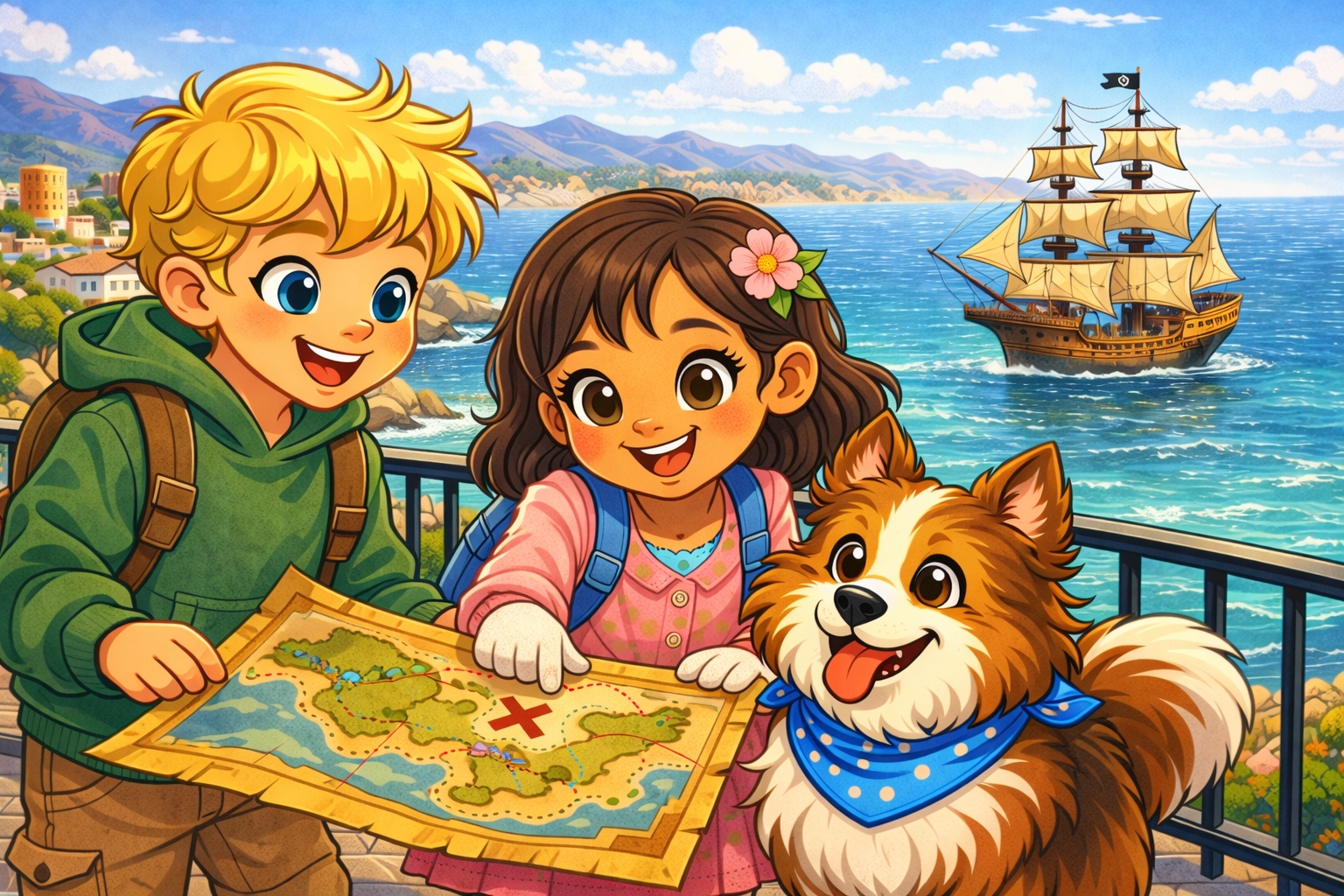 Once upon a sunny morning in the town of Nerja, three friends—Luna, Max, and Nico the dog—set off on an adventure. They were armed with a beach bag full of snacks, a pair of binoculars, and a map that Luna’s grandmother had drawn by hand.